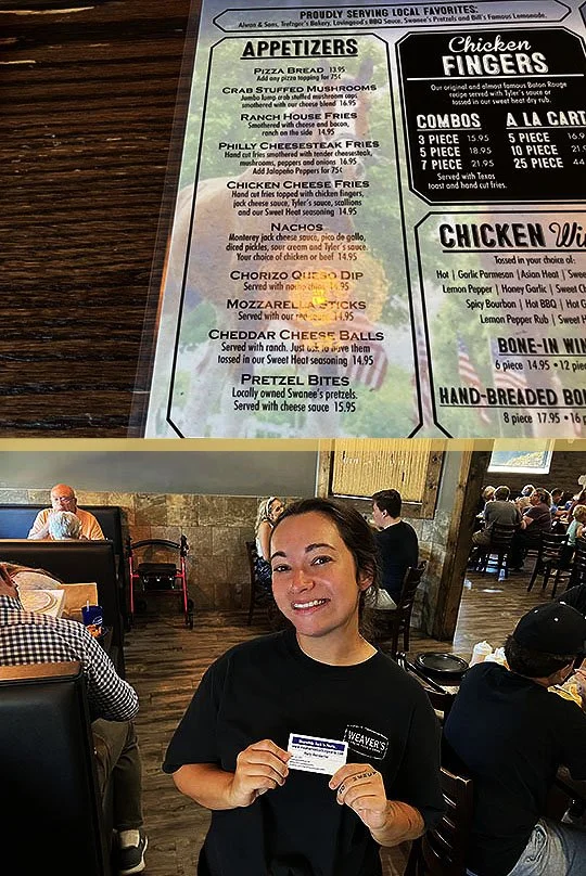 As you can see, they have a nice selection of appetizers on the menu and there’s our pretty and friendly waitress, Elizabeth who took our order and flashed the MBIP card for her photo!