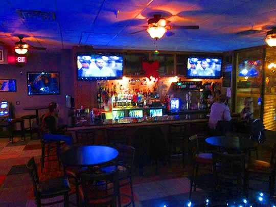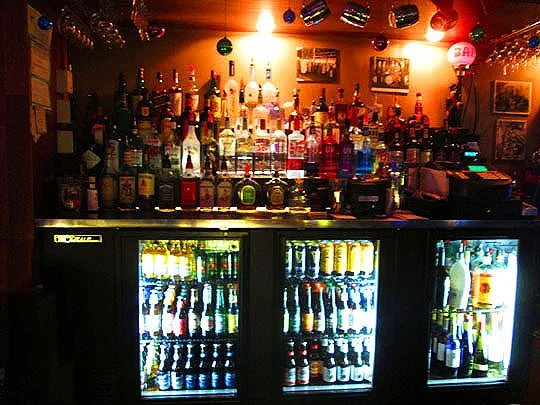 This is my view of the back of the well-stocked bar. As you can see, there's a nice selection of bottled beers in the coolers below the lit-up bottles on display.