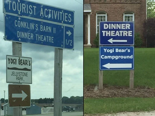 But then come to think of it, I had noticed something on my way into Goodfield that day that didn’t seem right: Jellystone was no longer listed on the interstate exit sign under CAMPING. I hadn’t thought much about this in passing, as I know it costs big bucks to be on an interstate sign. And even though I couldn’t see Yogi, there most definitely was still a campground there in the distance. Maybe Yogi’s dues had run out and he no longer felt the signage was necessary? Especially since all the other signs leading to Jellystone were still there...