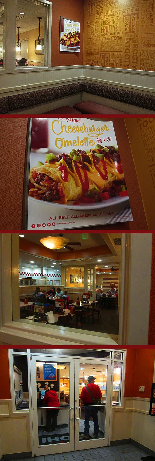 Once inside the foyer i saw a picture hanging over in the corner that caught my eye. It’s a picture of a Cheeseburger Omelette and it is really grossing me out so badly! I’m not trying to be crude here, but it looks like someone ate an abortion and then vomited it up and wrapped it in a two-bit tortilla and squirted mustard and ketchup all over it in a most haphazard manner. Ugh! I looked into the main dining area and heard screams from little kids and really thought about leaving. But against my better judgement, I decided to brave this storm of abortion-styled food and little kid screams and ventured inside for our pancake dinner.