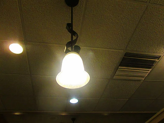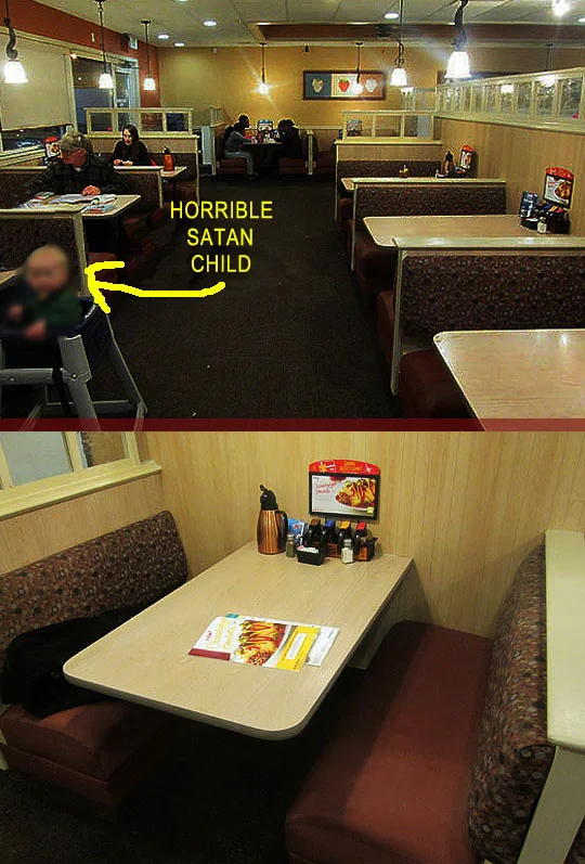 I decided to sit in a booth over here away from that kid-infested main dining area, but check out the little fucker in the baby chair staring at me! I fuzzed his little sickening face out because I don’t like putting pictures of babies and children on the blog because...well, I can’t stand most babies and children and this little asshole is no exception to that rule. In addition to staring at me, he alternately screamed and cried the whole time I was in here. Well, let’s just sit down at this booth and be thankful I’m deaf in my left ear.