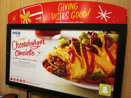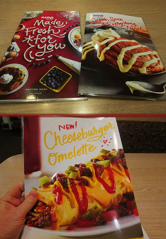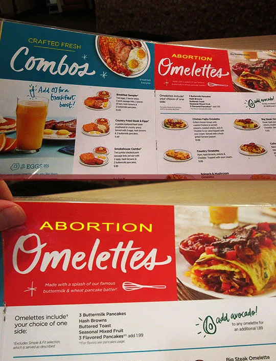 There it is again! Attention International House of Fucking Pancakes, I don’t want to eat your fucking Cheeseburger Abortion Omelettes and this constant signage you keep throwing at me isn’t going to change my mind so just fucking stop it already! Sheesh! Let’s just open the menu and figure out what kind of pancakes to order and get this fucking dinner over with already!