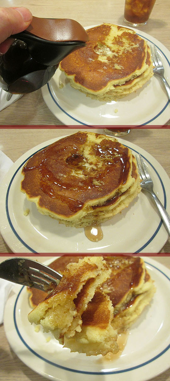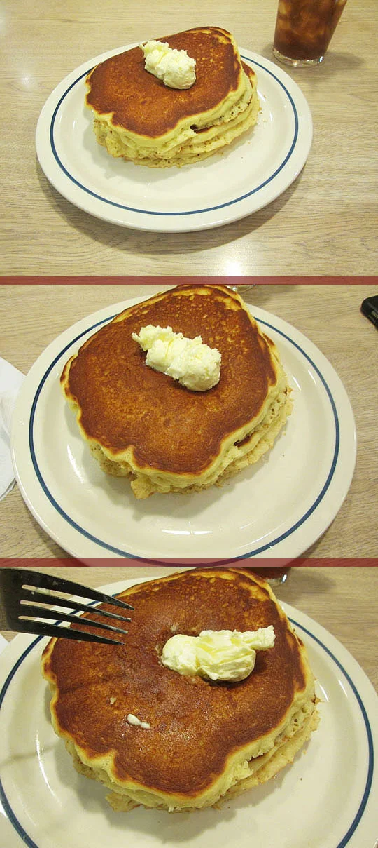 Well, she was right, the pancakes arrived shortly after I ordered them, but notice how they’re just plopped willy-nilly on the plate all off center and everything. Plus there’s a big honking blob of butter on top of them. I prefer to put my own butter on my pancakes and I like it melted so I started moving it around to facilitate the melting process.