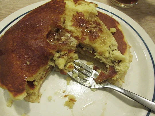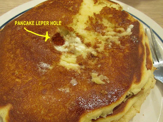 Wow, these are really fucking horrible tasting pancakes! They have a sickening chalky flavor to them and it tastes like skin from a leper after he’s had to clean off a chalkboard for being naughty in leper school. Between the abortion omelettes and these chalky leper pancakes they should rename this place to, “International House of Medical Procedures Gone Horribly Awry.” In retrospect I guess this wasn’t a very good idea at all. Oh well, at least it’s over now. We’ll see you all tomorrow!